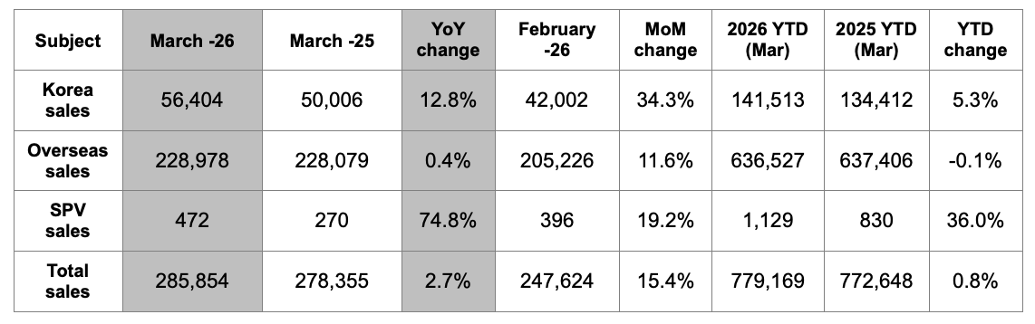 În martie, Kia a vândut 56.404 unități pe piața coreeană, o creștere de 12,8% față de aceeași perioadă a anului trecut.